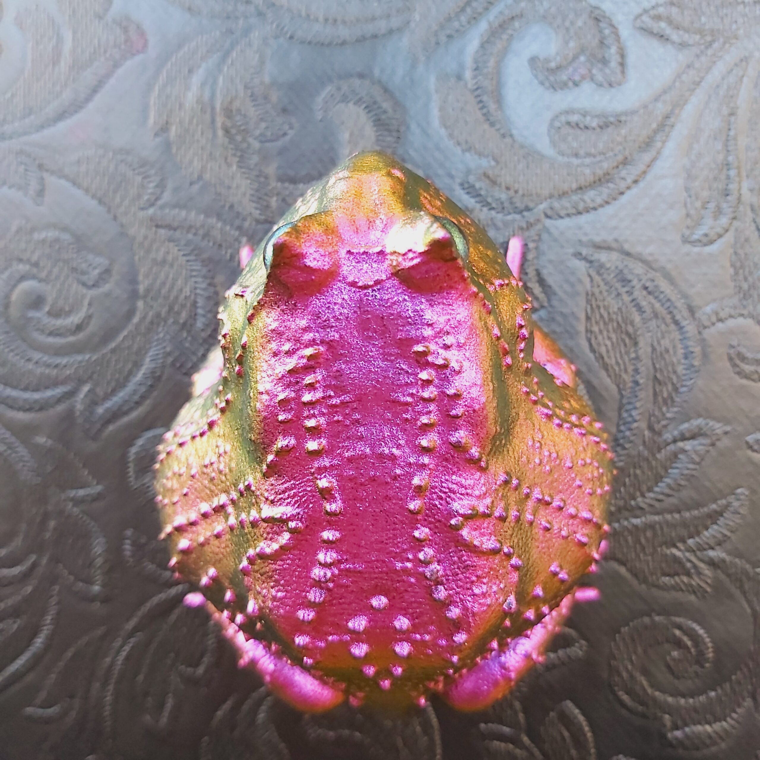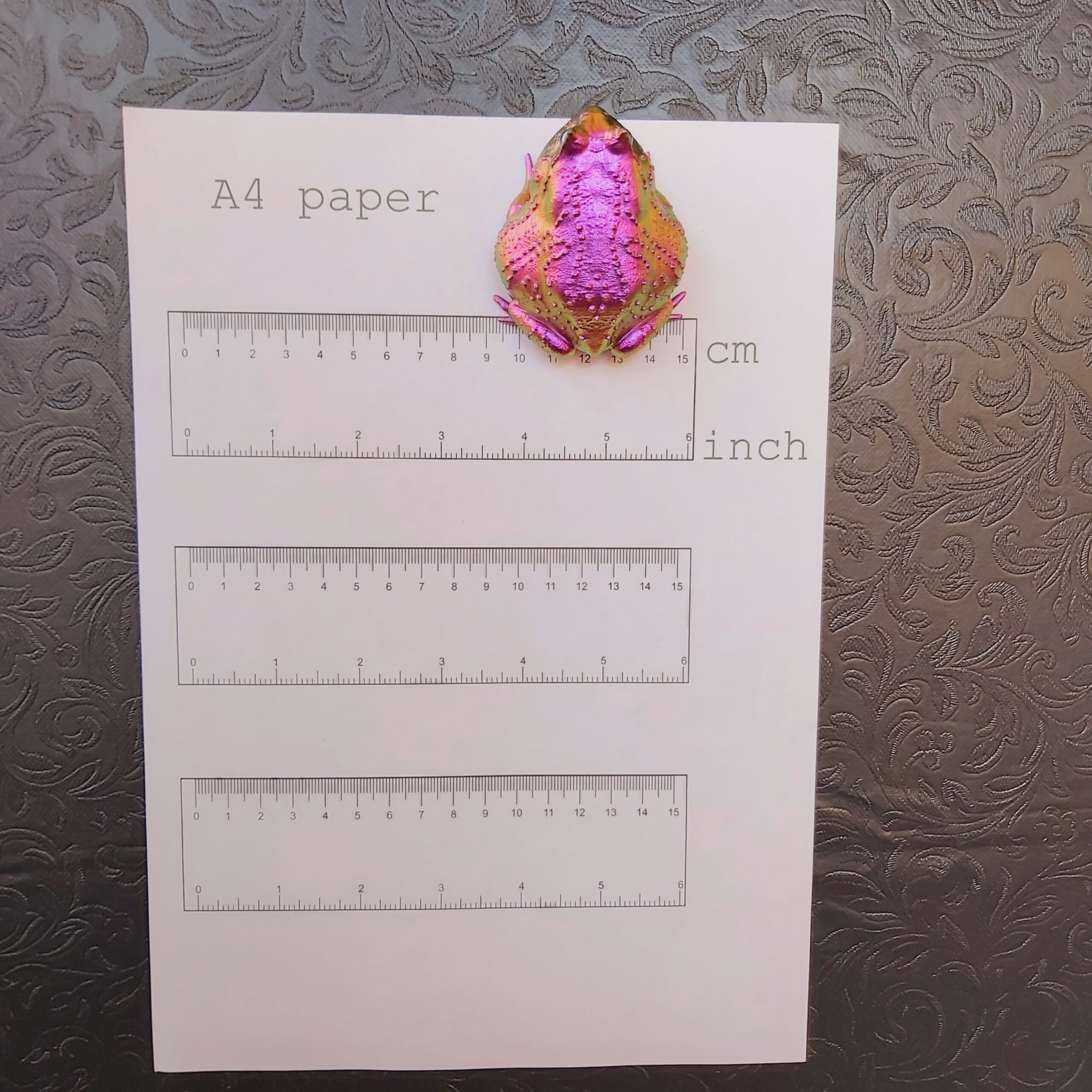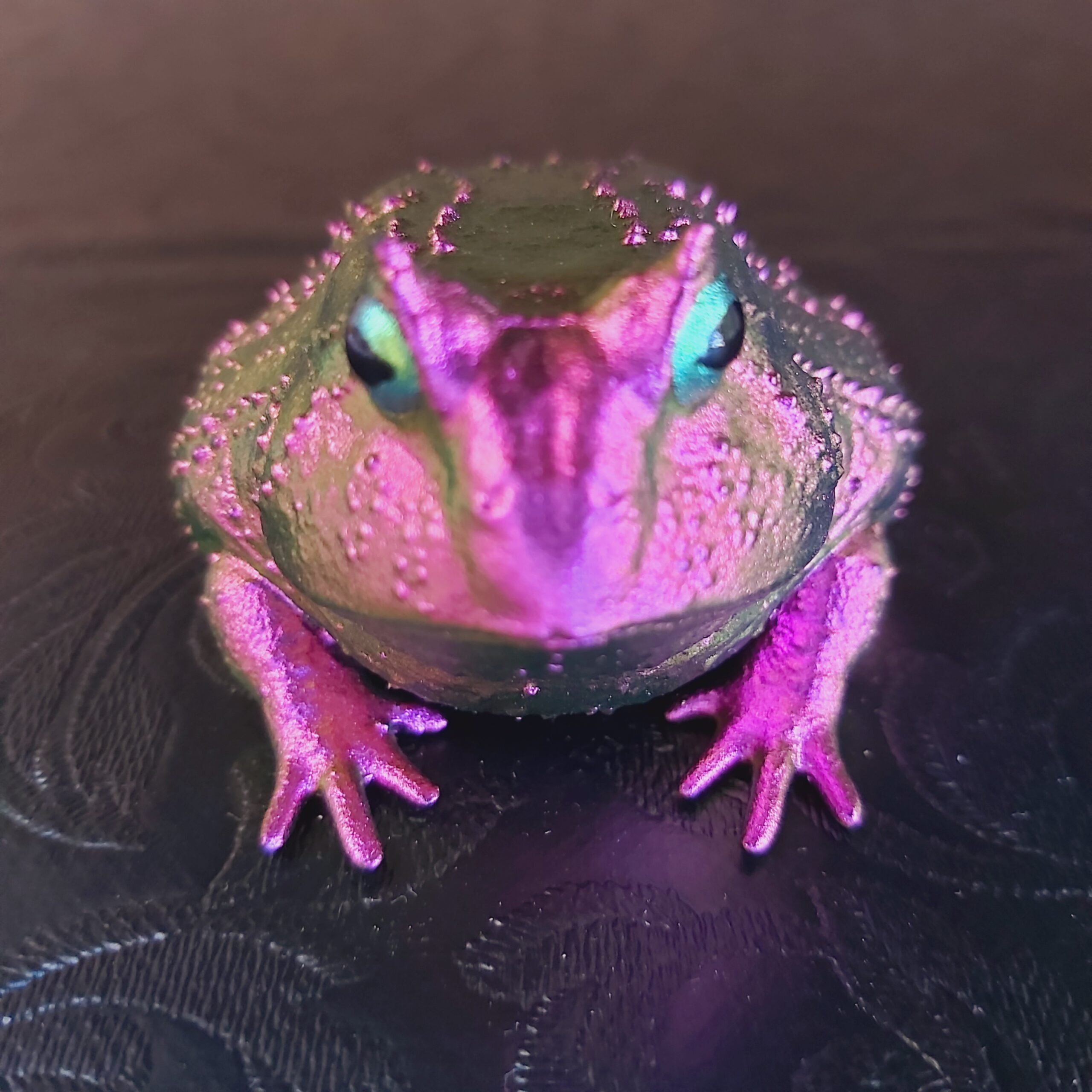 This unique 3D magnet features a charming colorshifting slingshot frog, designed to bring personality to your fridge, whiteboard, or any magnetic surface. The figure has two very strong neodymium magnets embedded in the base using durable epoxy resin.