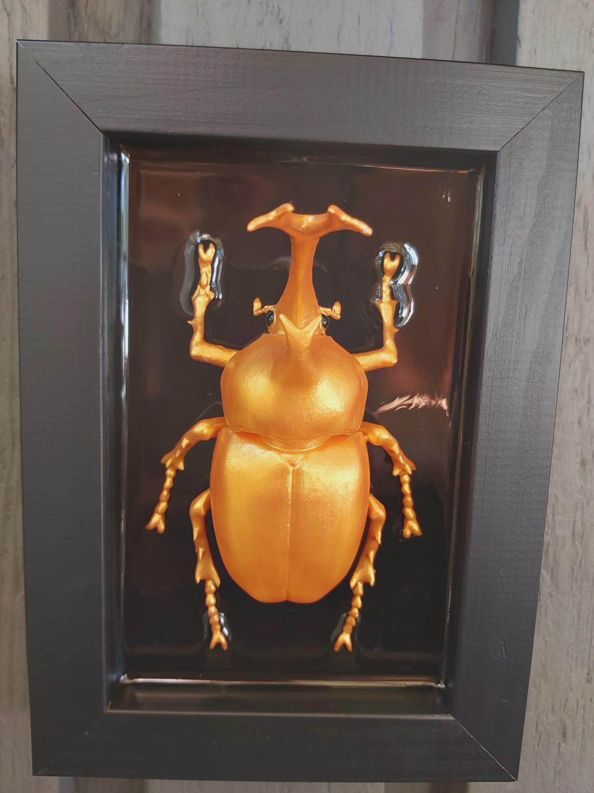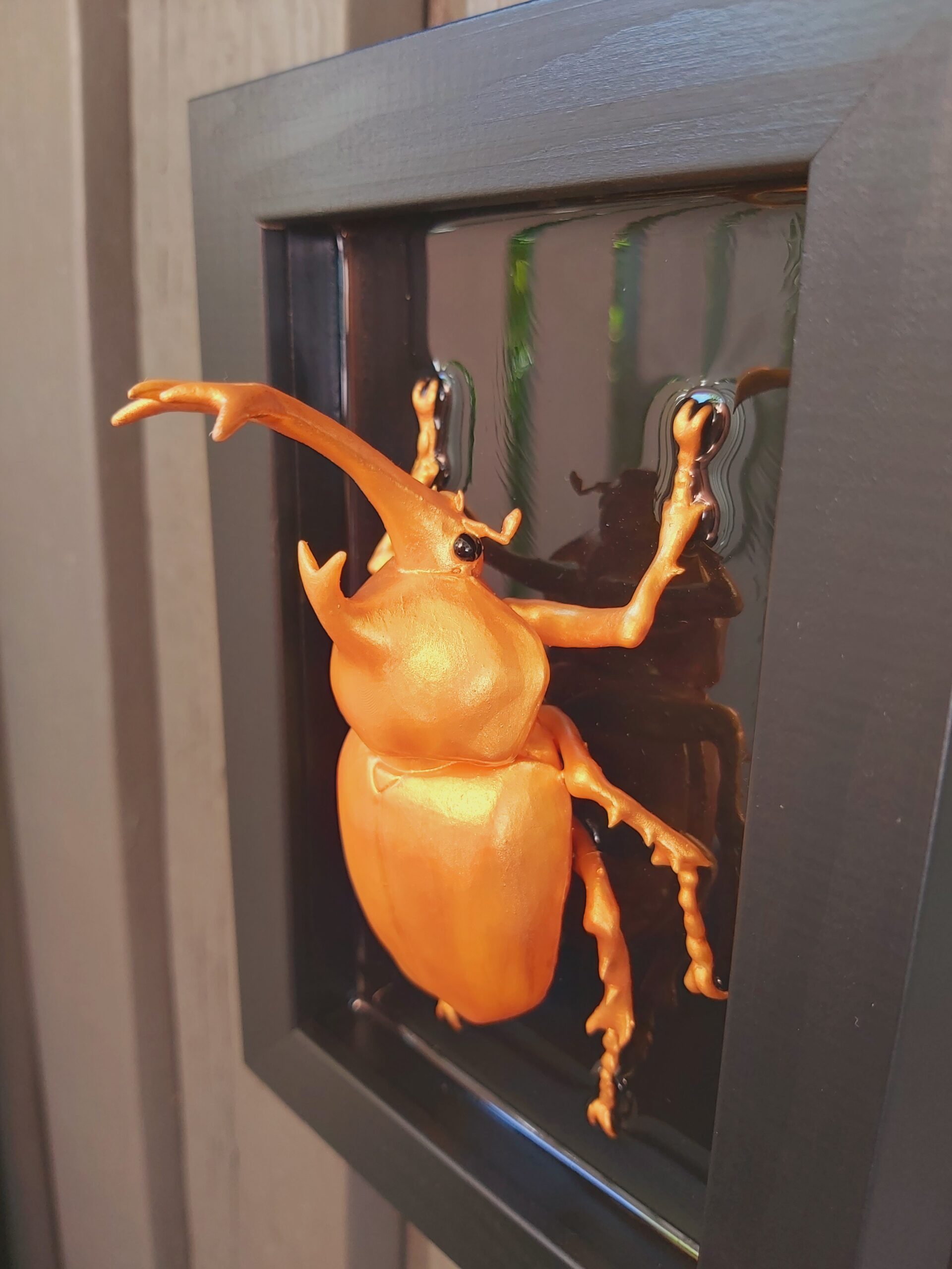 This golden Japanese Rhinoceros Beetle is set against a glossy black resin background.
