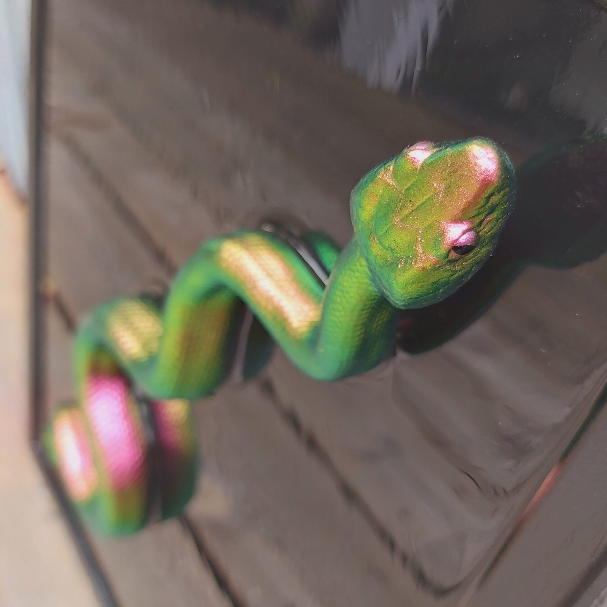 This striking 3D wall art presents a colorshifting Copperhead snake slithering in the frame for a lifelike effect. The snake is hand-painted, set against a glossy black epoxy resin background within a wooden frame.