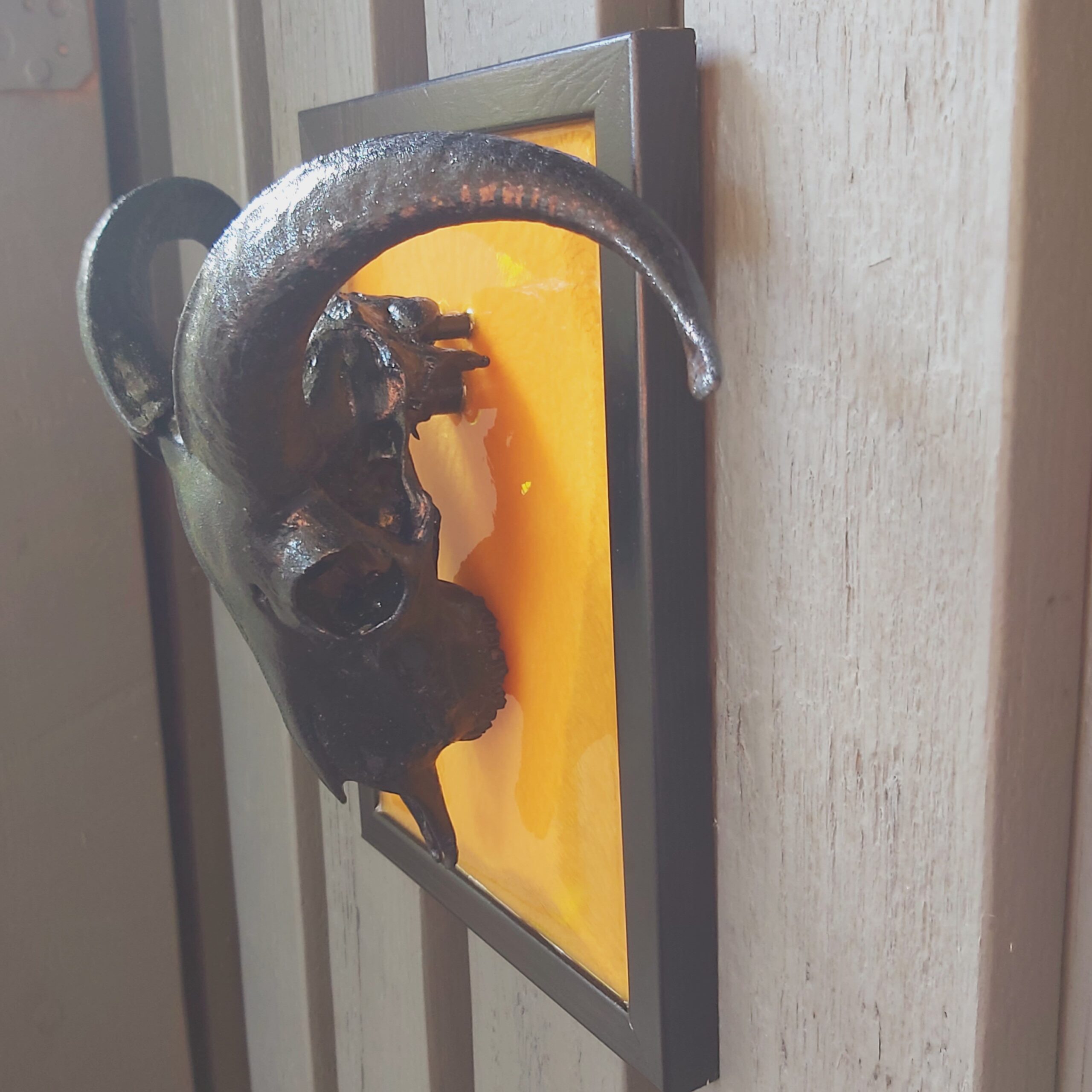 This striking 3D wall art features a detailed goat skull displayed against a deep, shimmery golden epoxy resin backdrop.