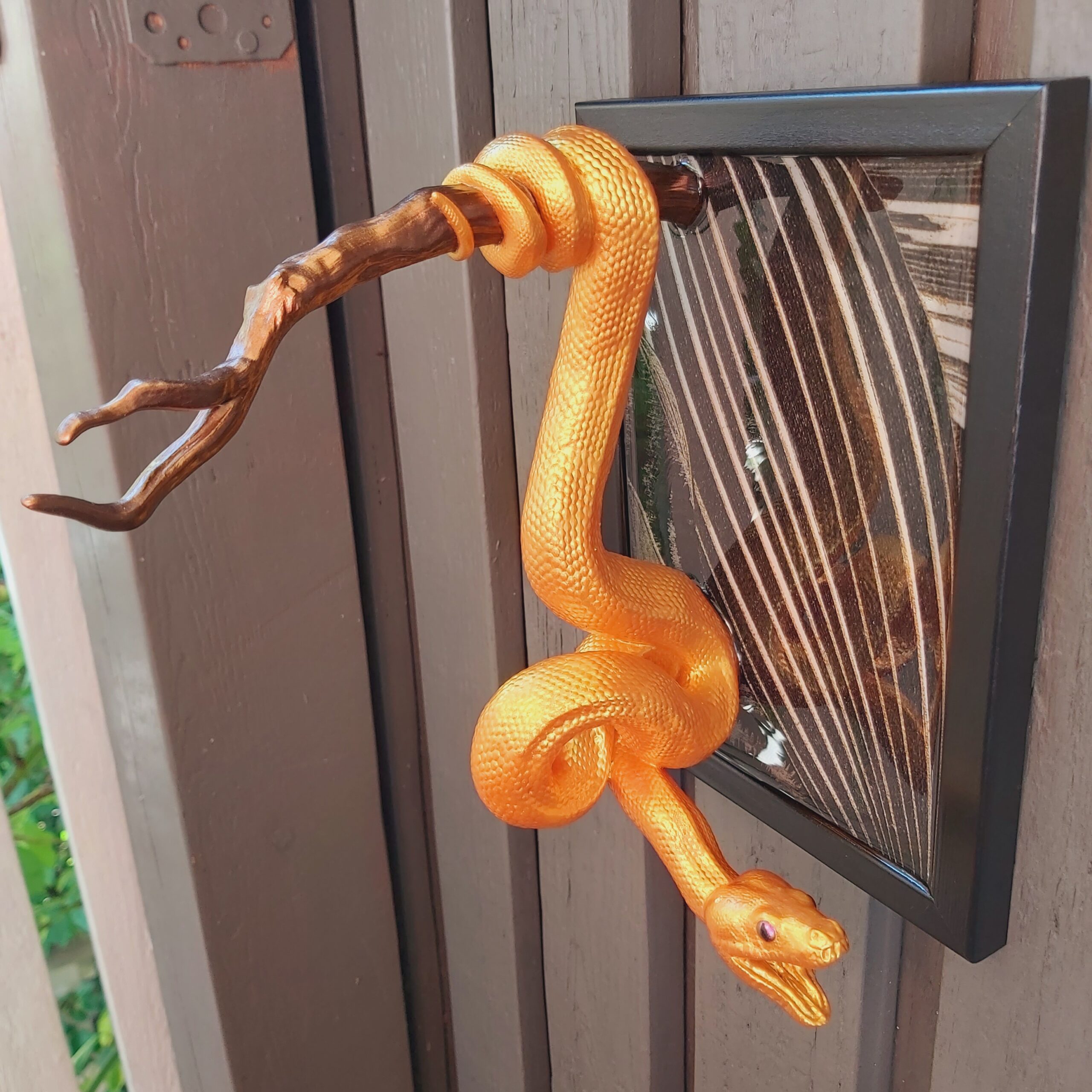 This striking 3D wall art showcases a green tree python hanging from a branch that stretches beyond the frame, creating a vivid sense of depth and realism. The snake and branch are meticulously hand-painted, set against a wallpaper backdrop within a wooden frame, and preserved beneath a smooth, glossy layer of transparent epoxy resin.