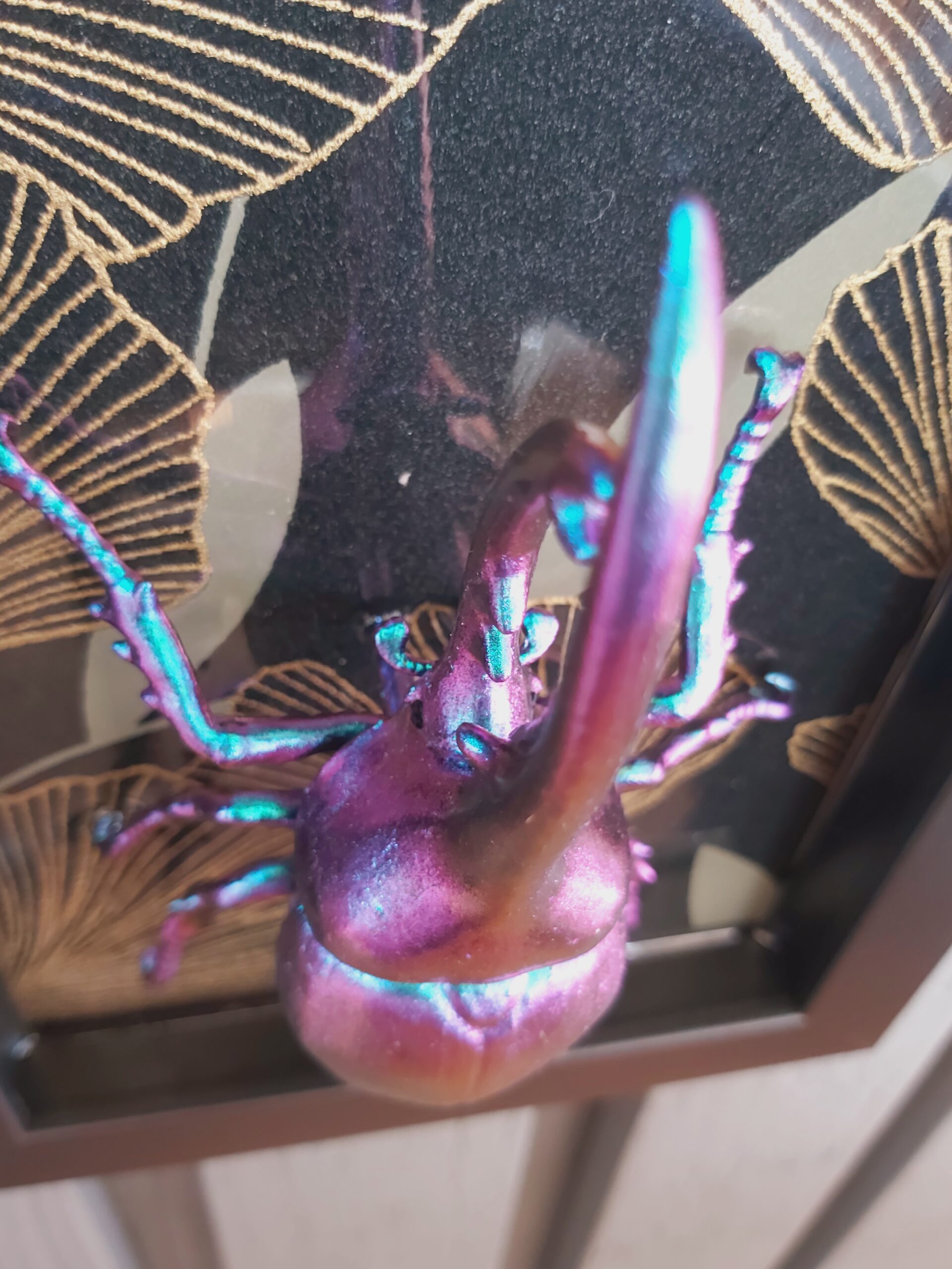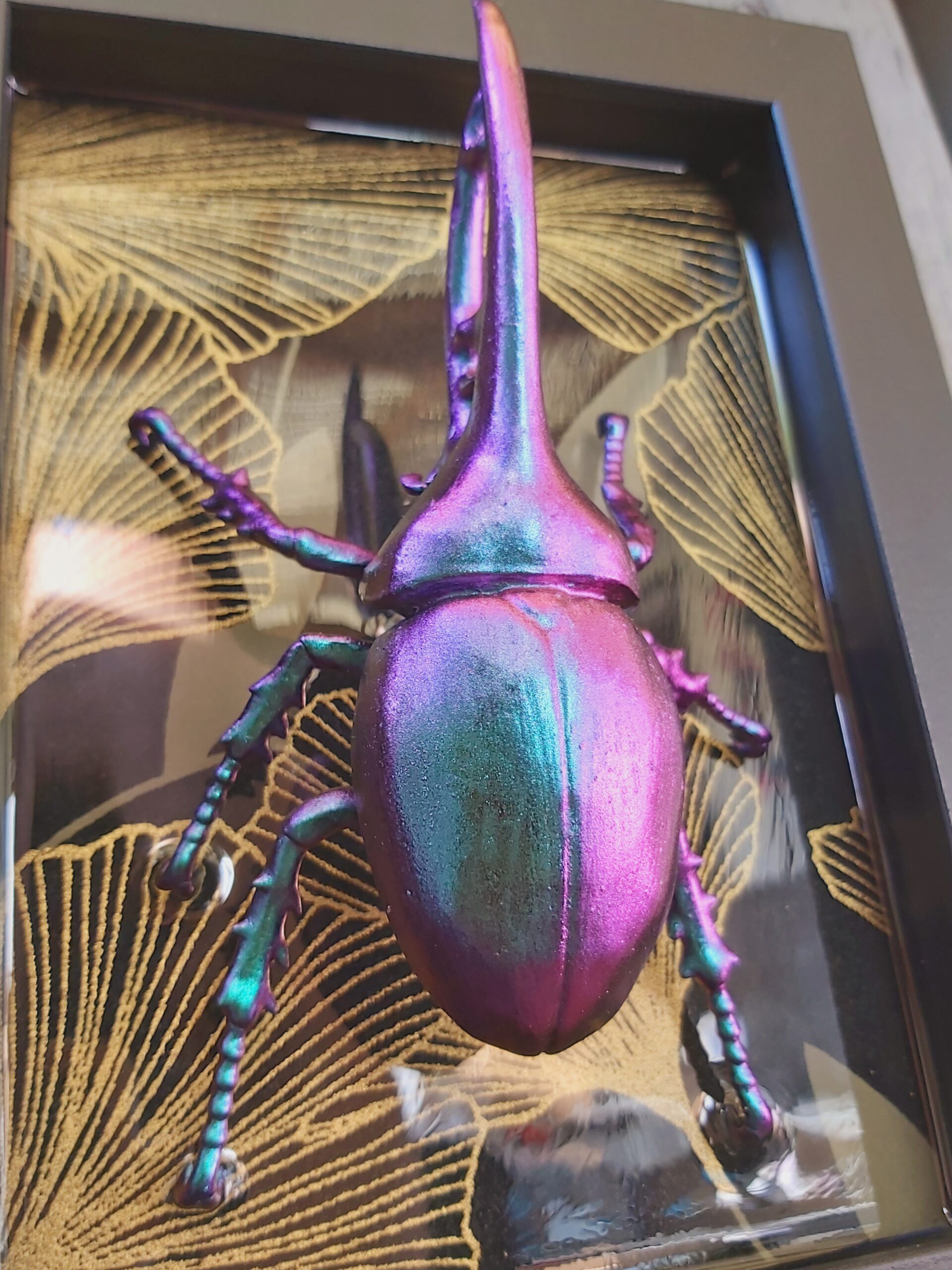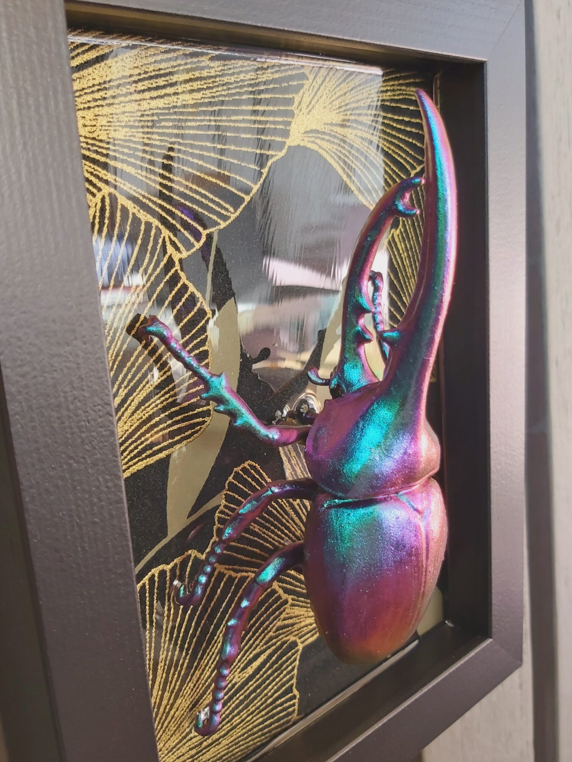 This hand-painted colorshifting Hercules Beetle is set against a wallpaper background in a wooden frame and preserved under a glossy layer of transparent epoxy resin.
