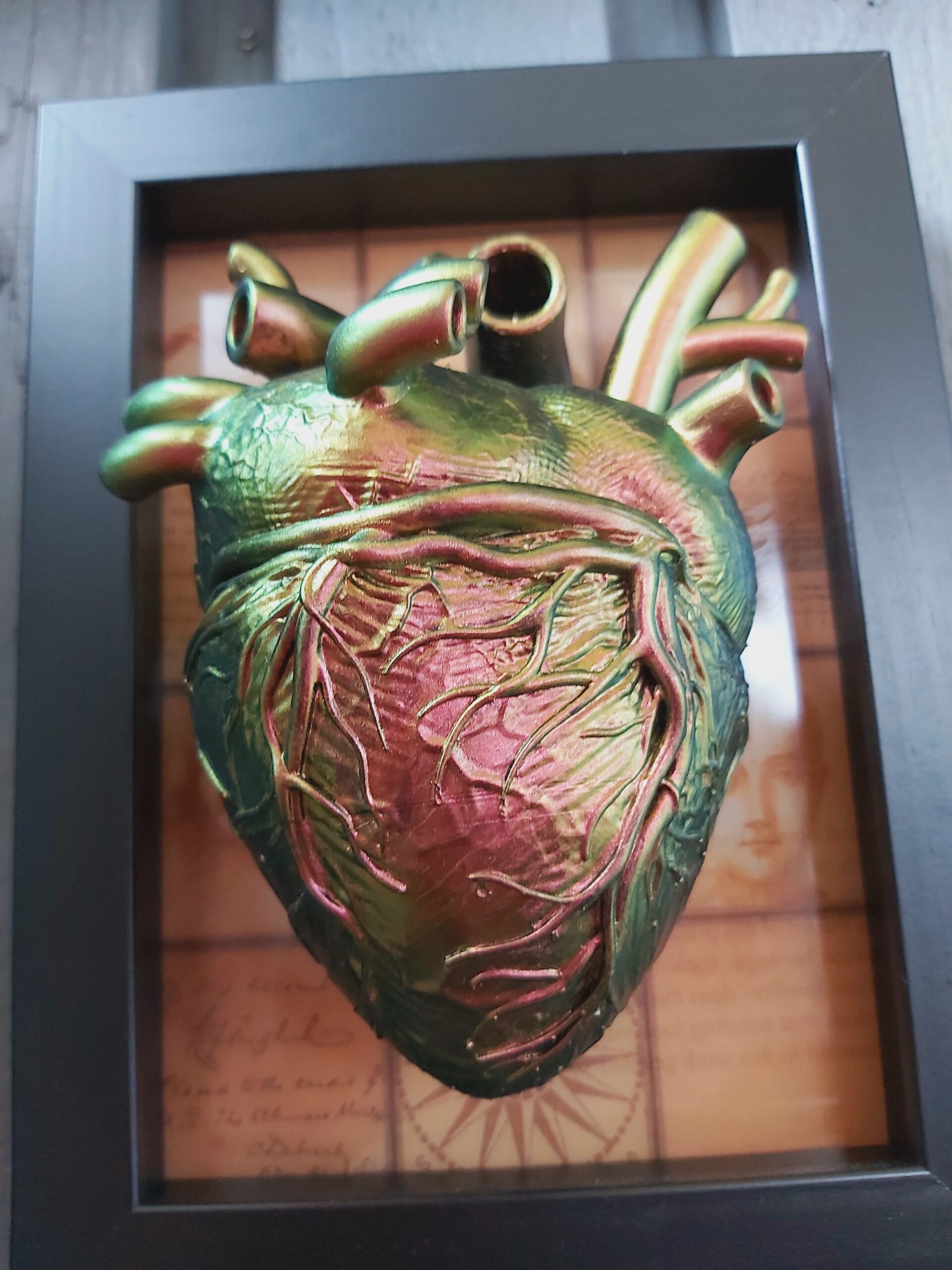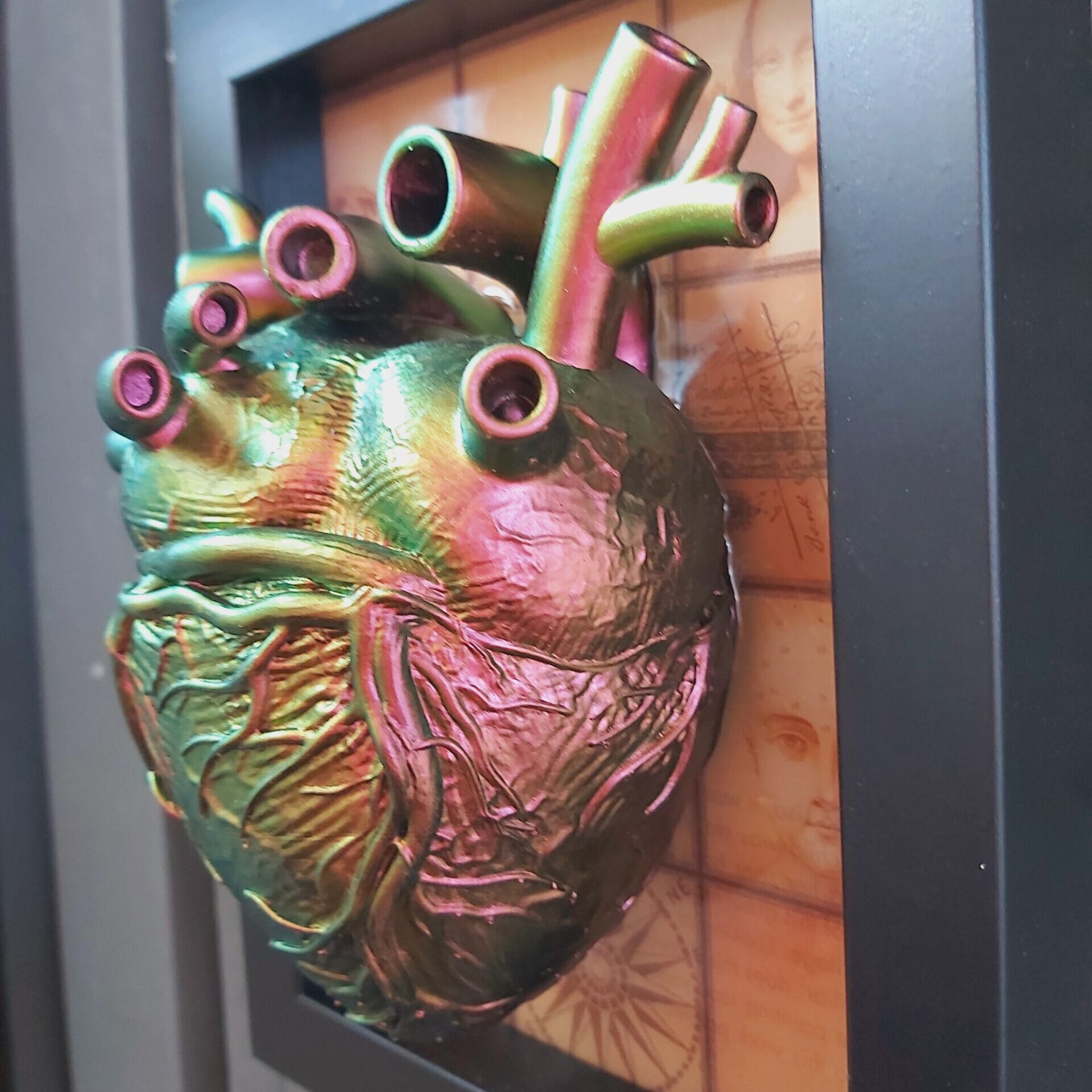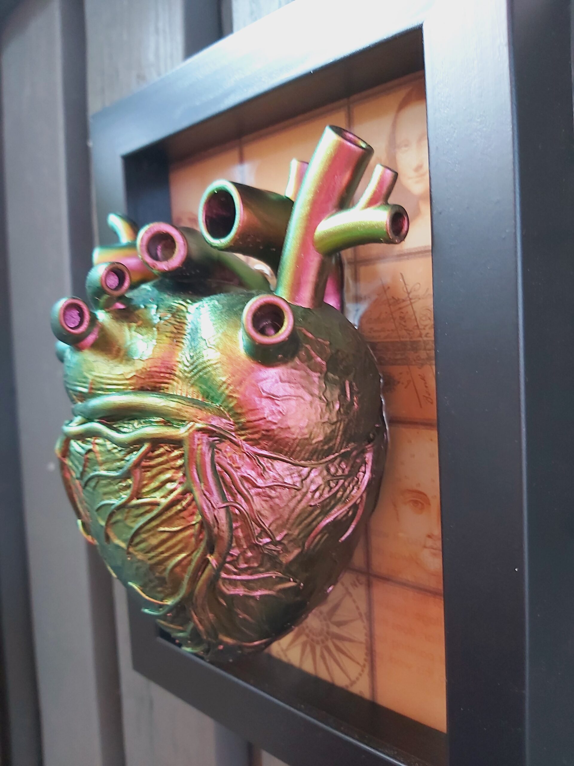An atmospheric anatomical heart emerges in fine detail, set against a patterned wallpaper background and preserved beneath a sleek layer of glossy resin.