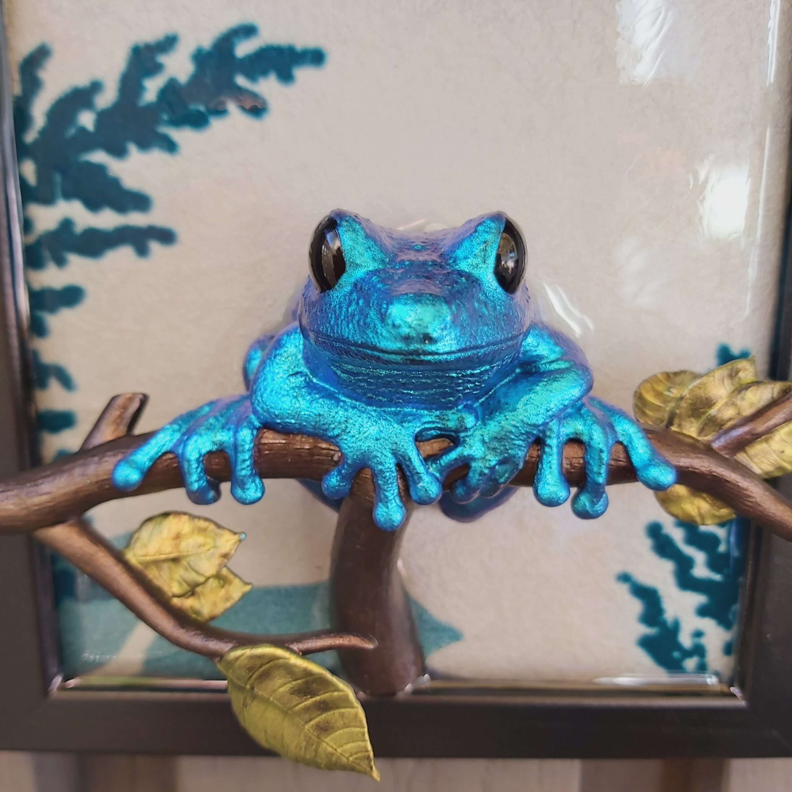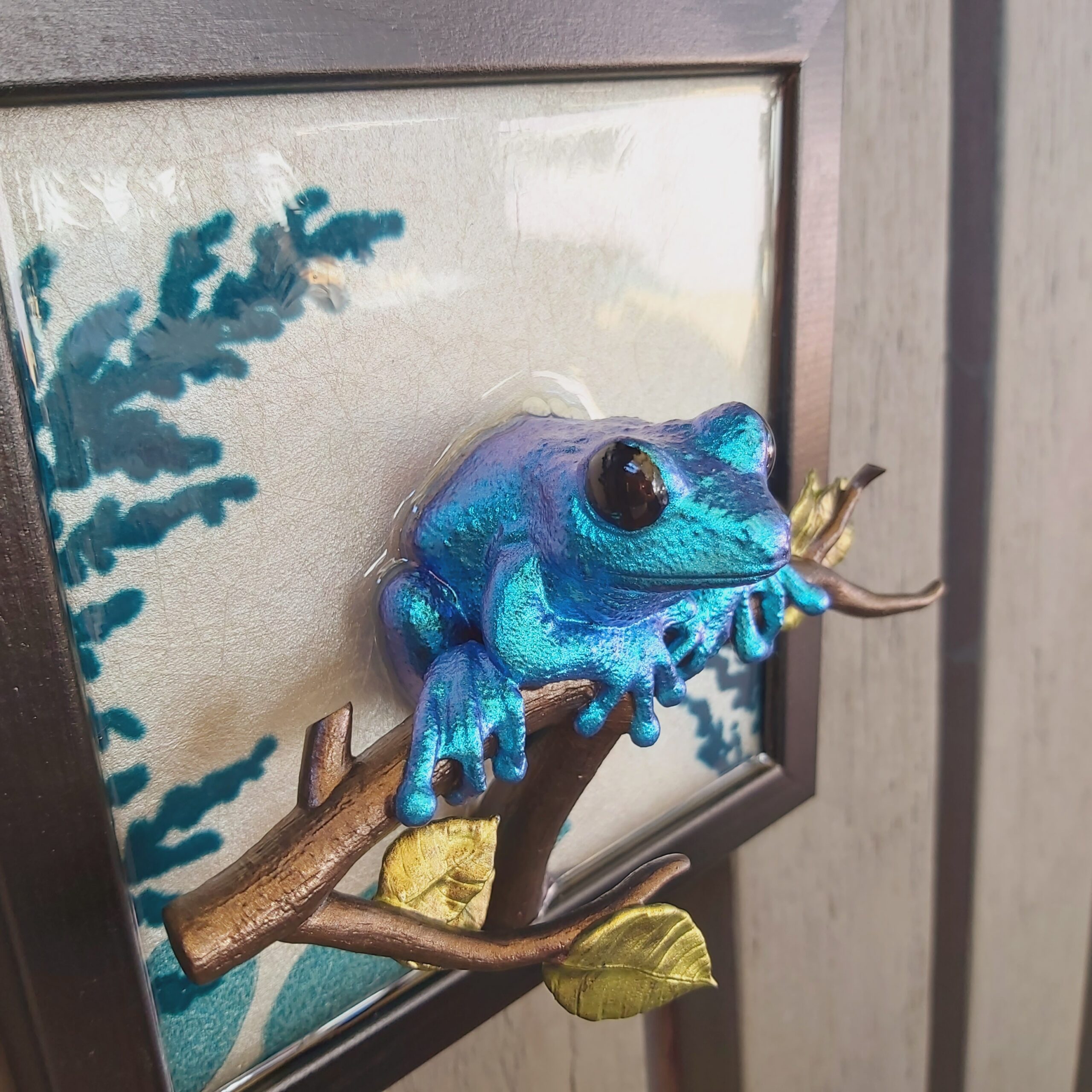 This striking 3D wall art features a maroon-eyed frog clinging to a leafy branch, its gaze extending beyond the frame for a captivating, lifelike presence. The frog and the branch are hand-painted, set against a wallpaper background in a wooden frame and preserved under a glossy layer of transparent epoxy resin.