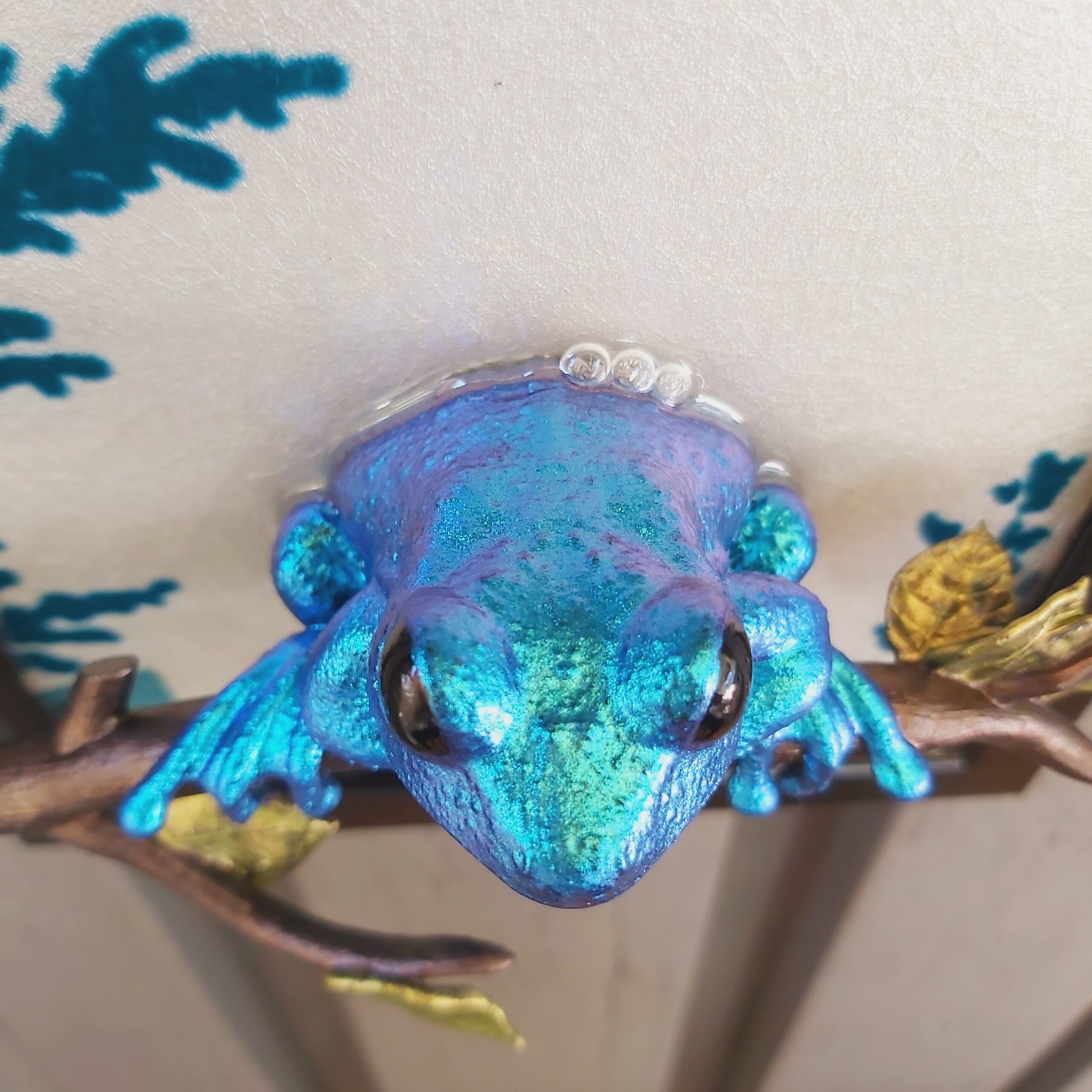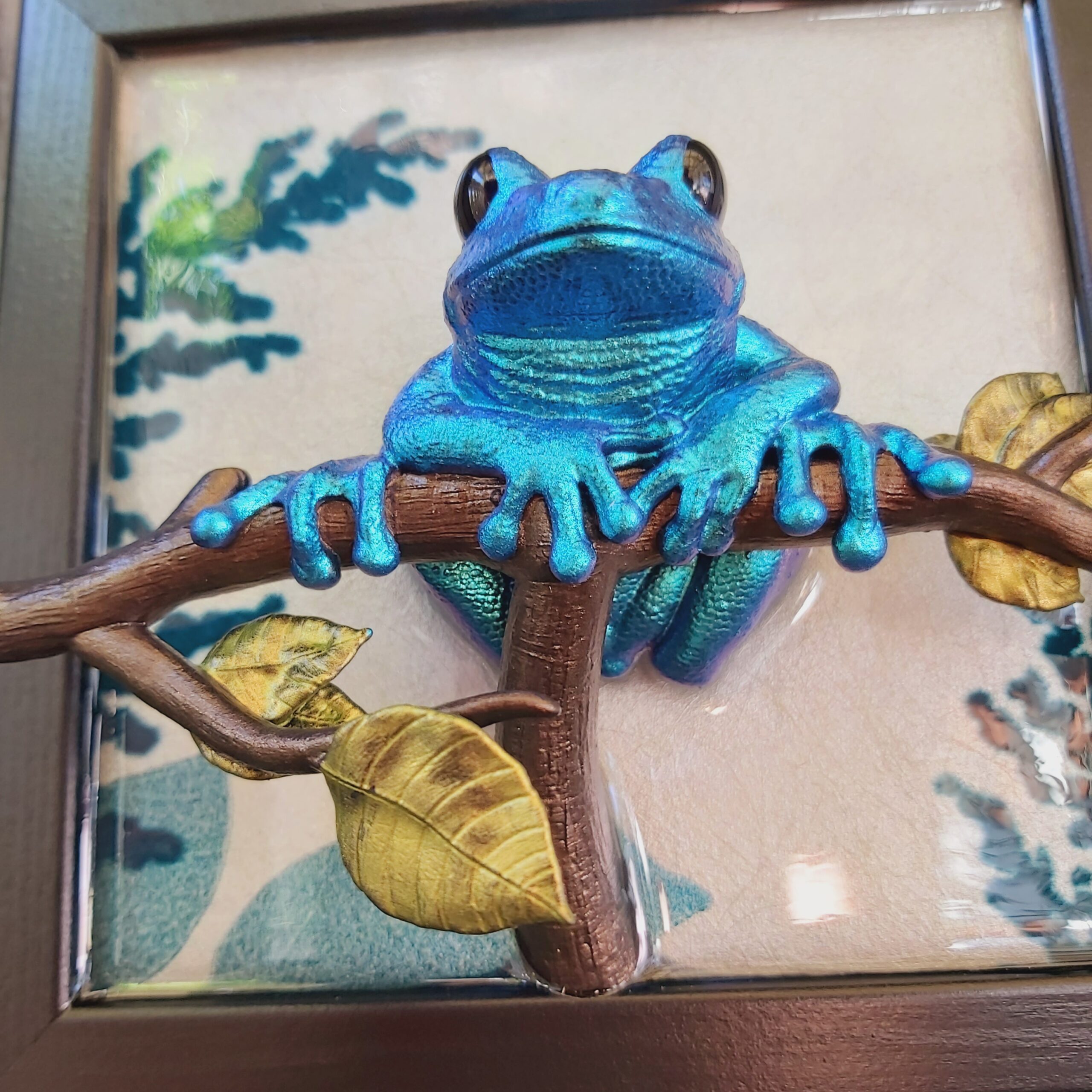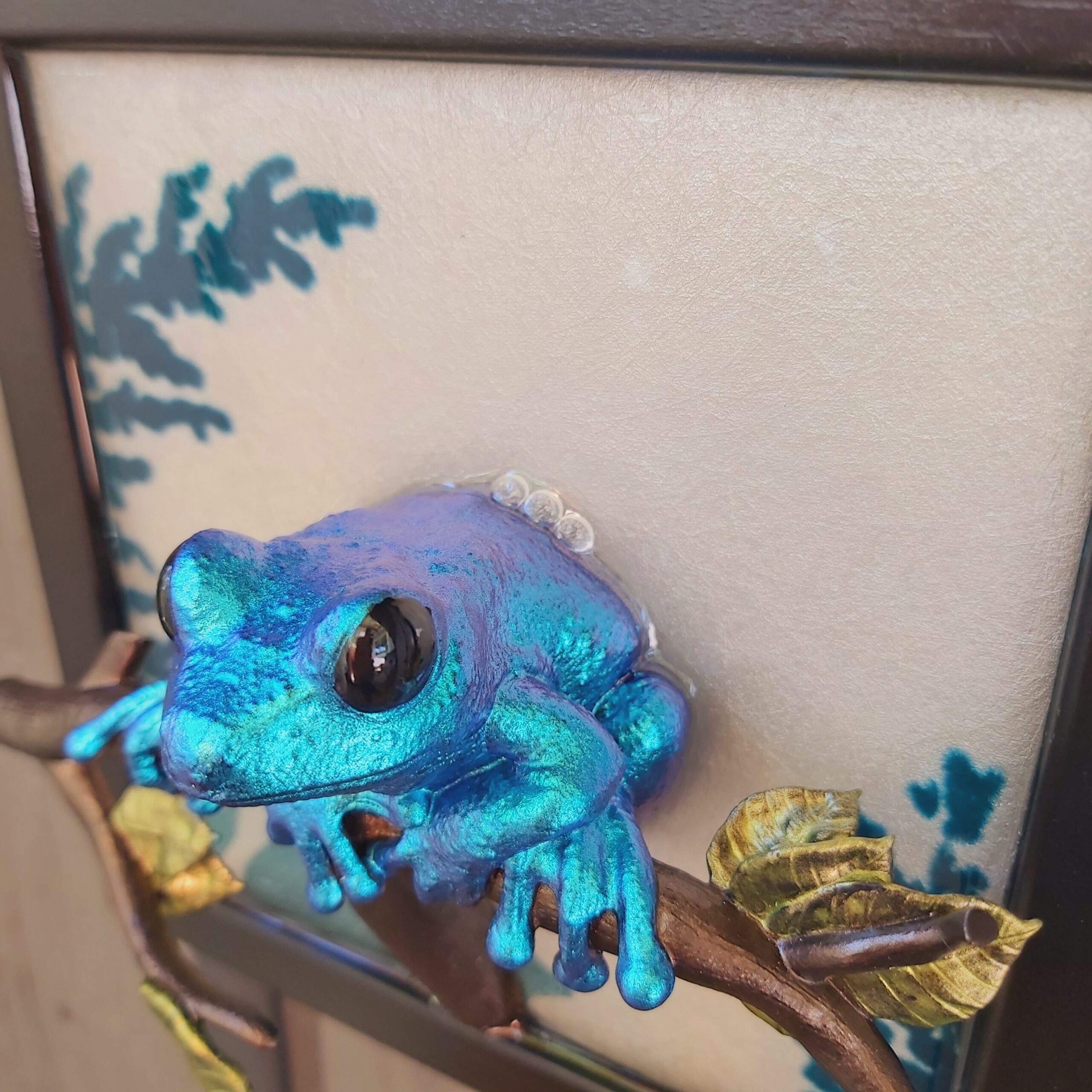 This striking 3D wall art features a maroon-eyed frog clinging to a leafy branch.