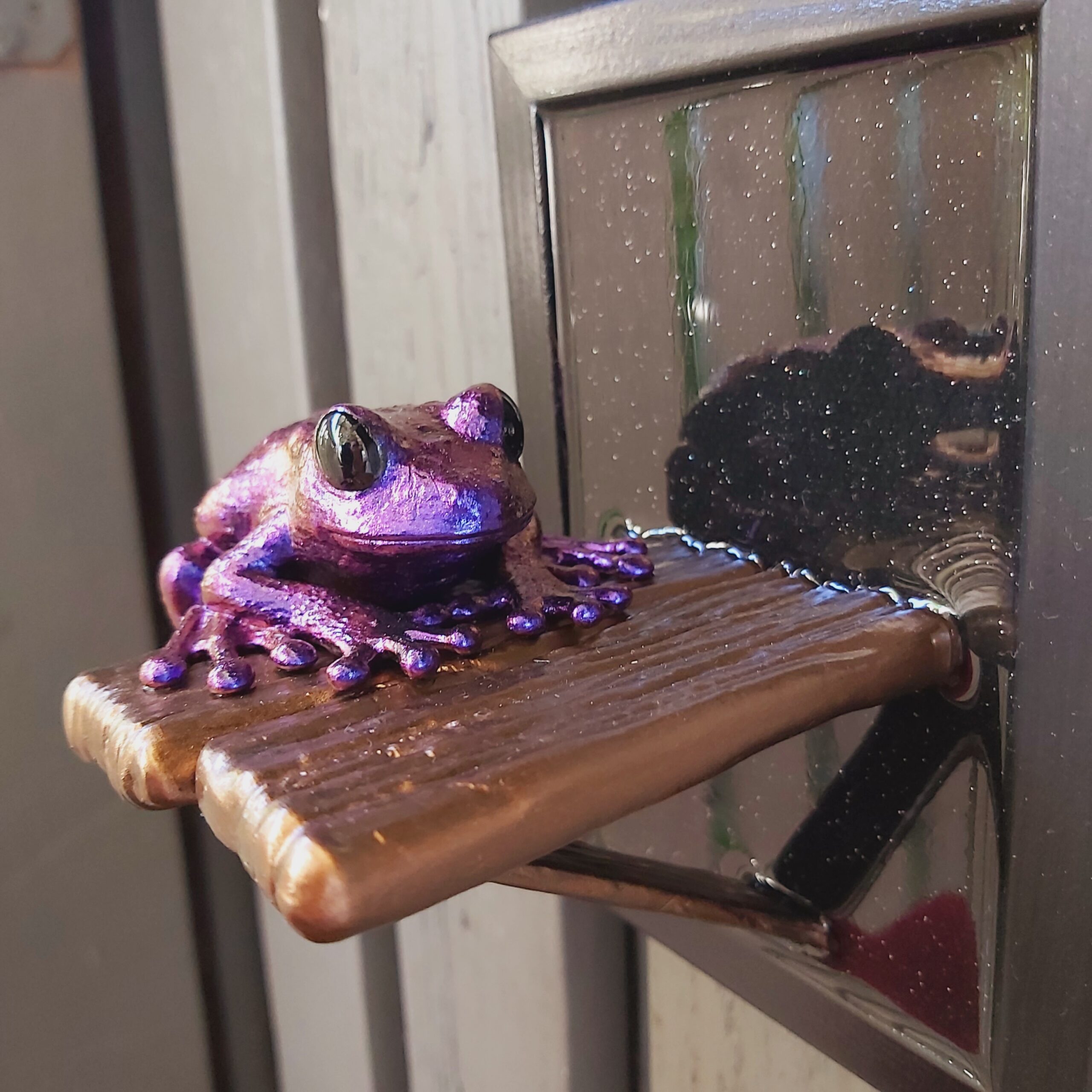This eye-catching 3D wall art features a maroon-eyed frog hanging sideways from a shelf, its toes planted and its curious gaze fixed ahead.