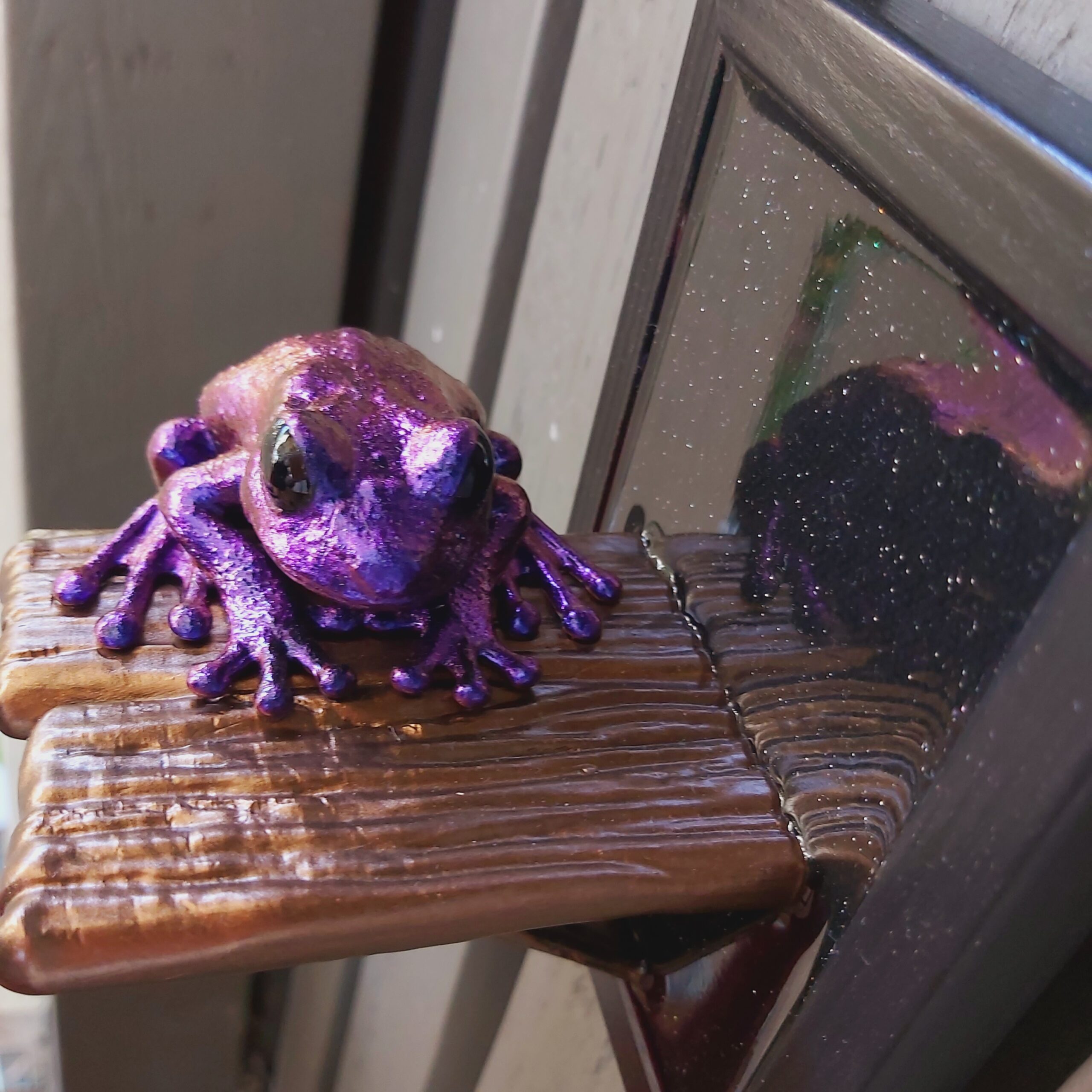 This eye-catching 3D wall art features a maroon-eyed frog hanging sideways from a shelf, its toes planted and its curious gaze fixed ahead. The frog and shelf are hand-painted, set against a glittery wallpaper background in a wooden frame and preserved under a glossy layer of transparent epoxy resin.