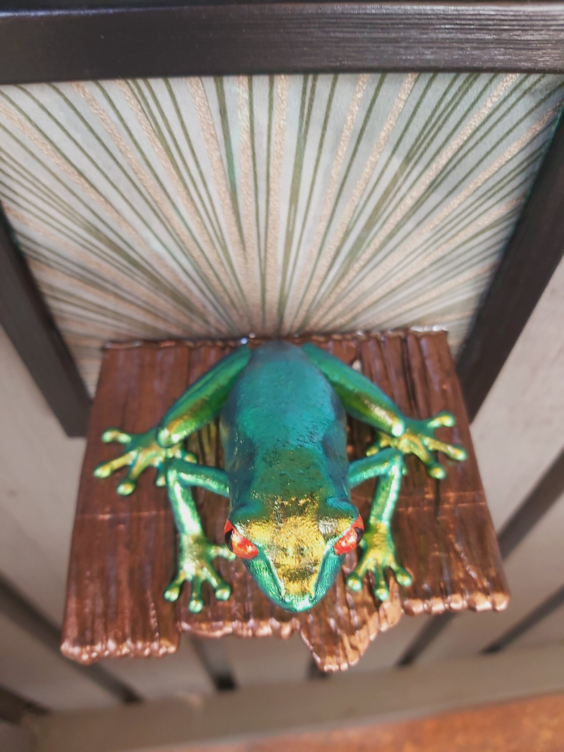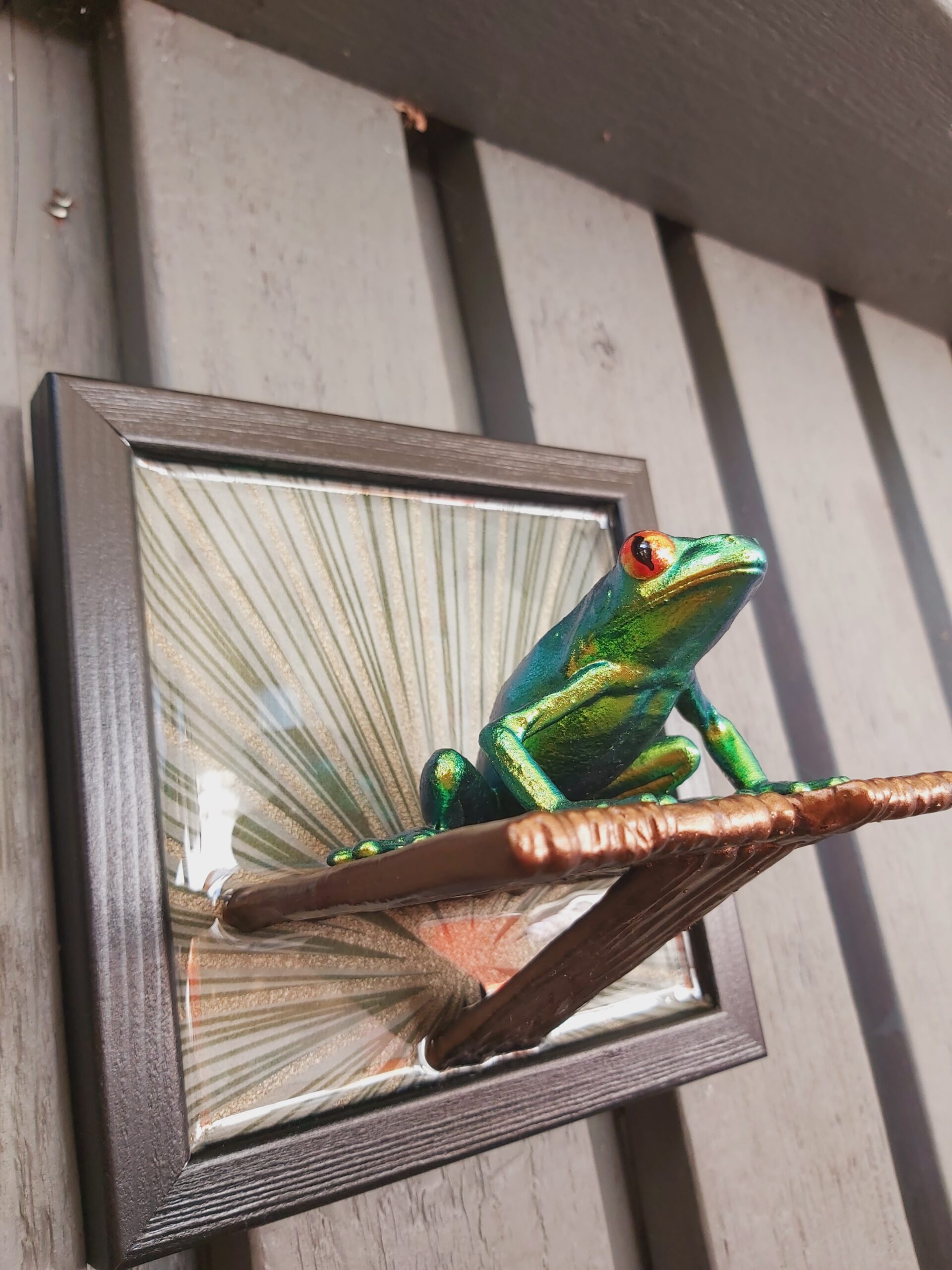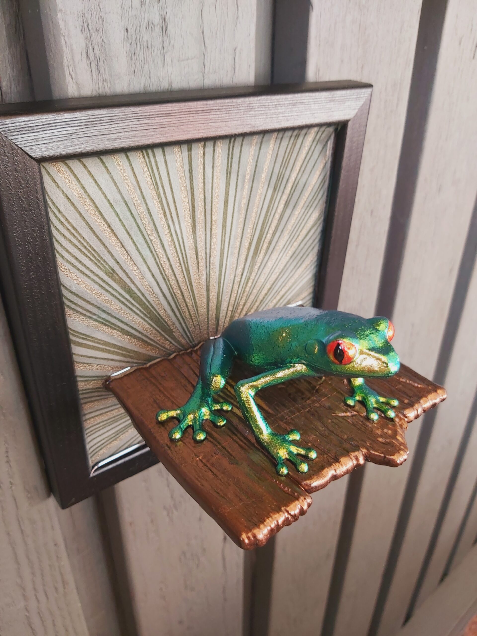 This vibrant 3D wall piece showcases a red-eyed tree frog poised on a shelf, its bright gaze directed straight ahead. The frog and shelf are carefully hand-painted, set against a wallpaper backdrop, framed in wood, and sealed beneath a smooth, high-gloss layer of clear epoxy resin.