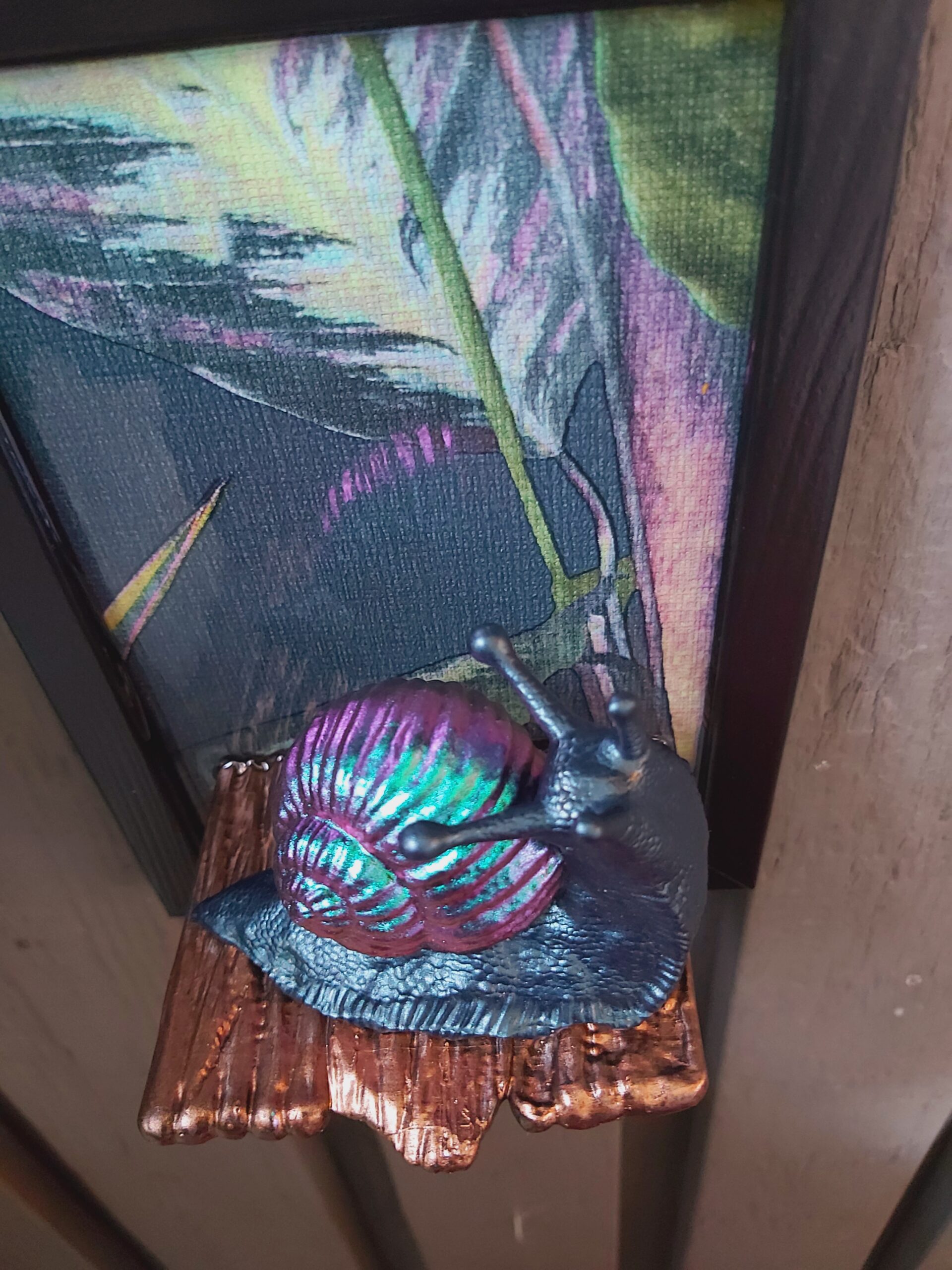 This unique 3D wall art features a snail with a colorshifting shell curiously looking up from a shelf. The snail and shelf are hand-painted, set against a wallpaper background in a wooden frame and preserved under a glossy layer of transparent epoxy resin.