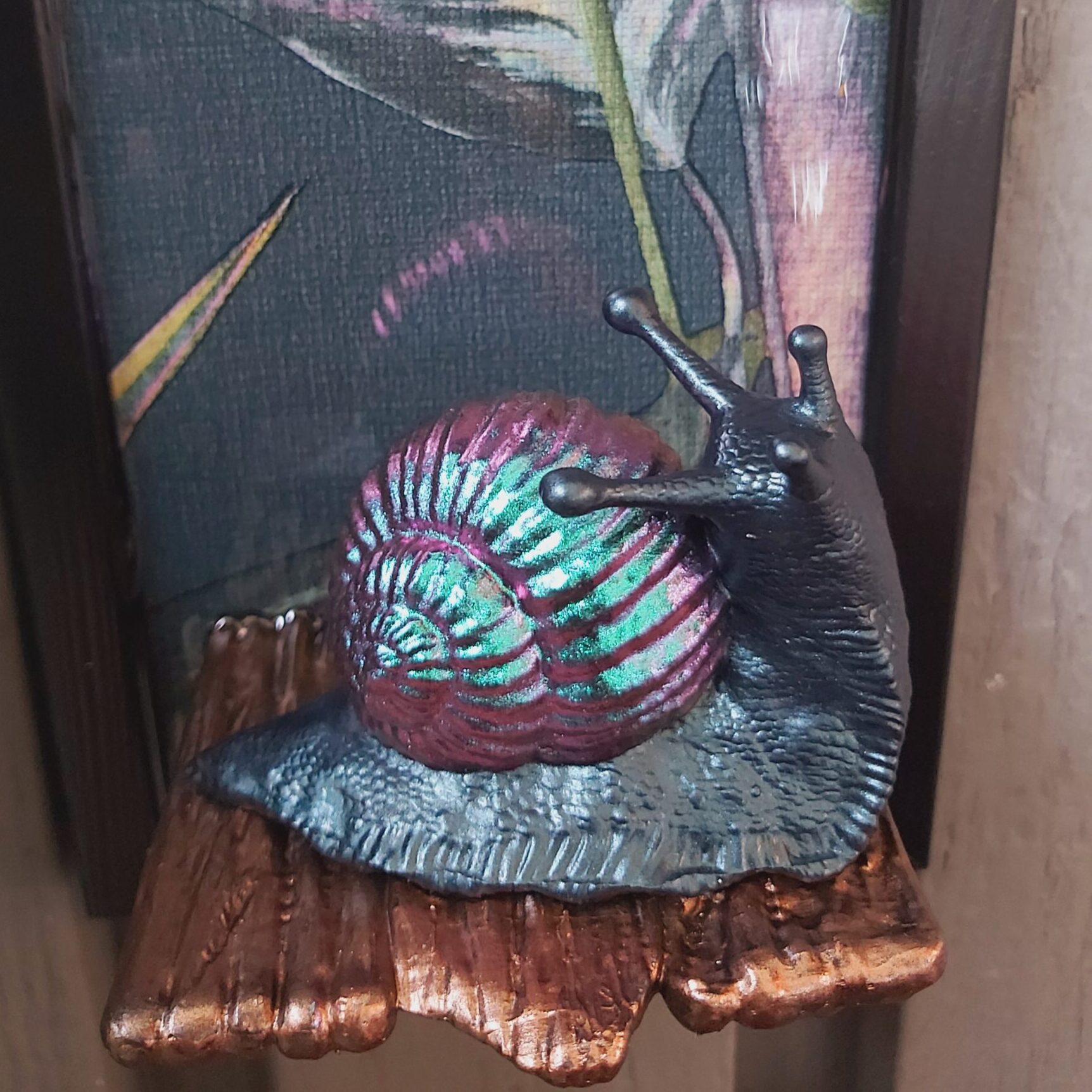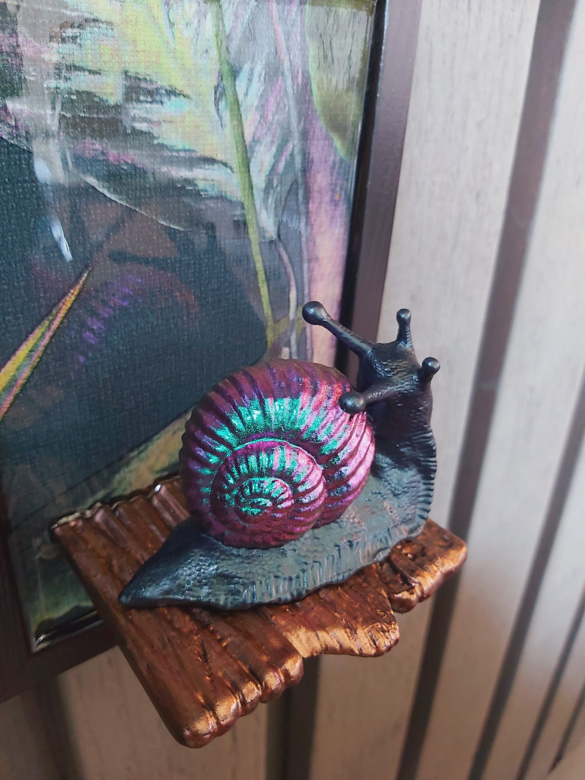 This unique 3D wall art features a hand-painted snail curiously looking up from a shelf.