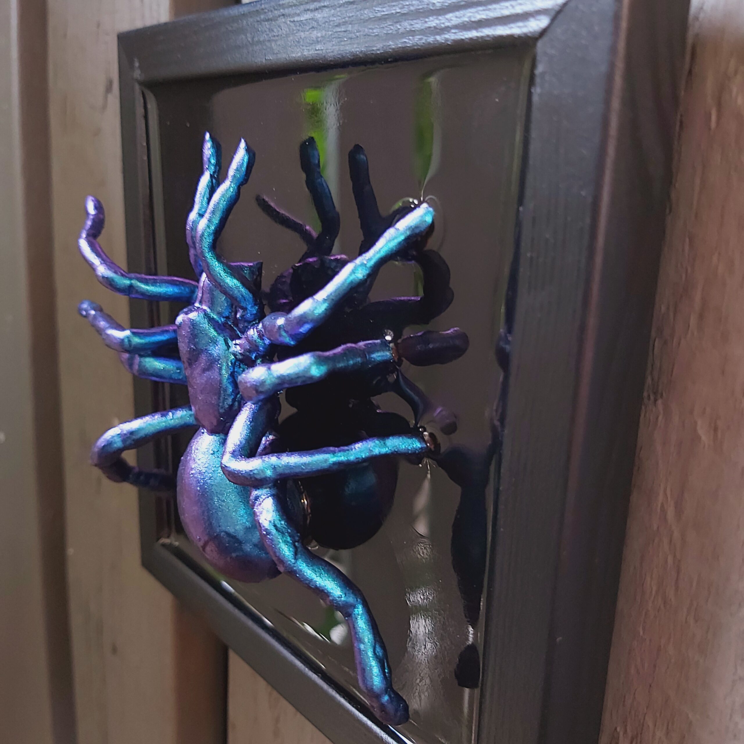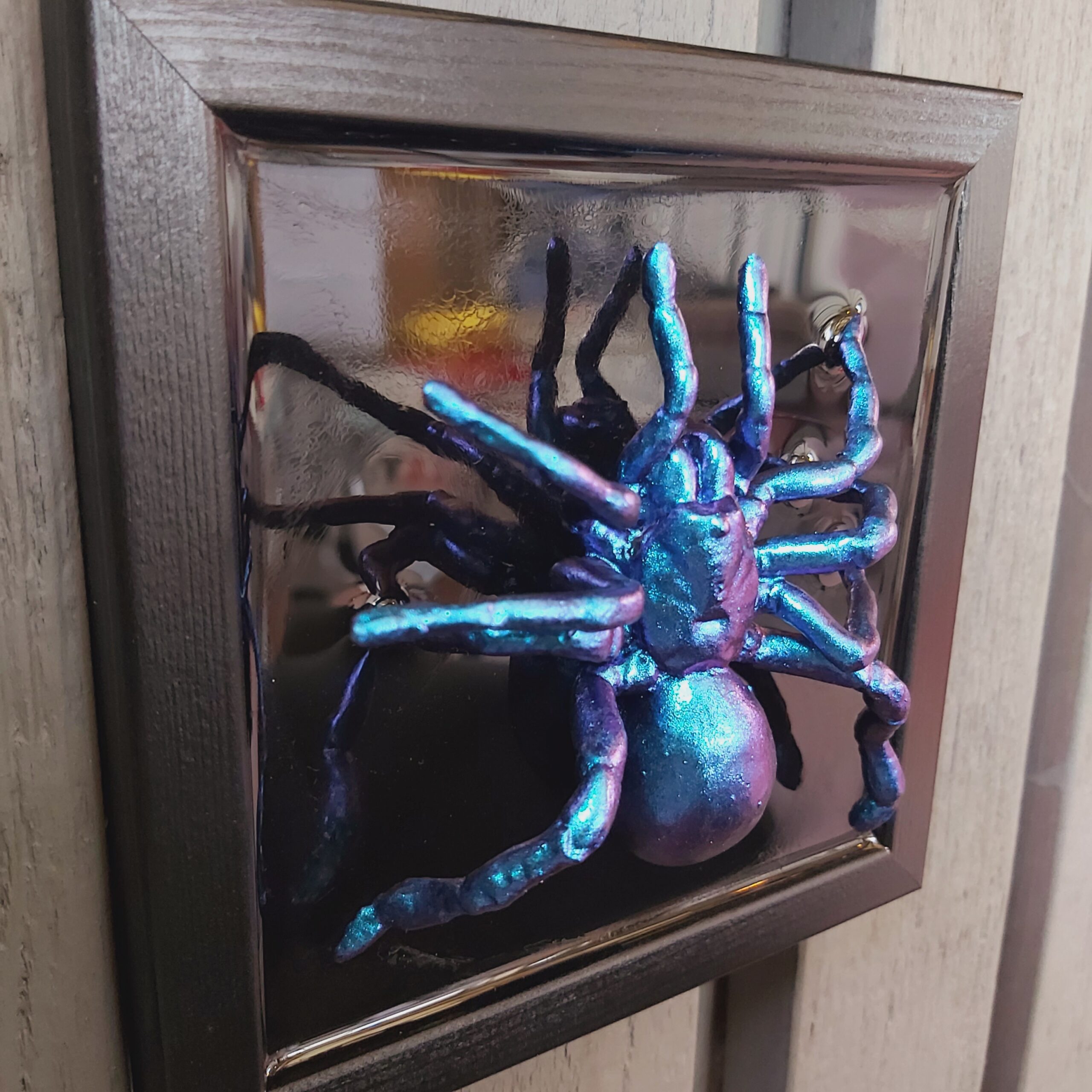 A lovely tarantula rests against a sleek, glossy black resin backdrop.