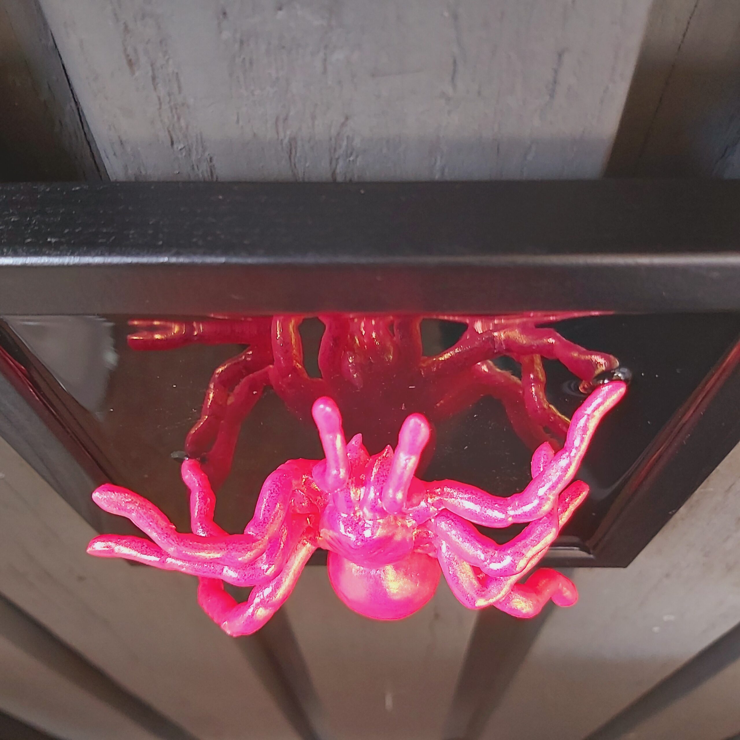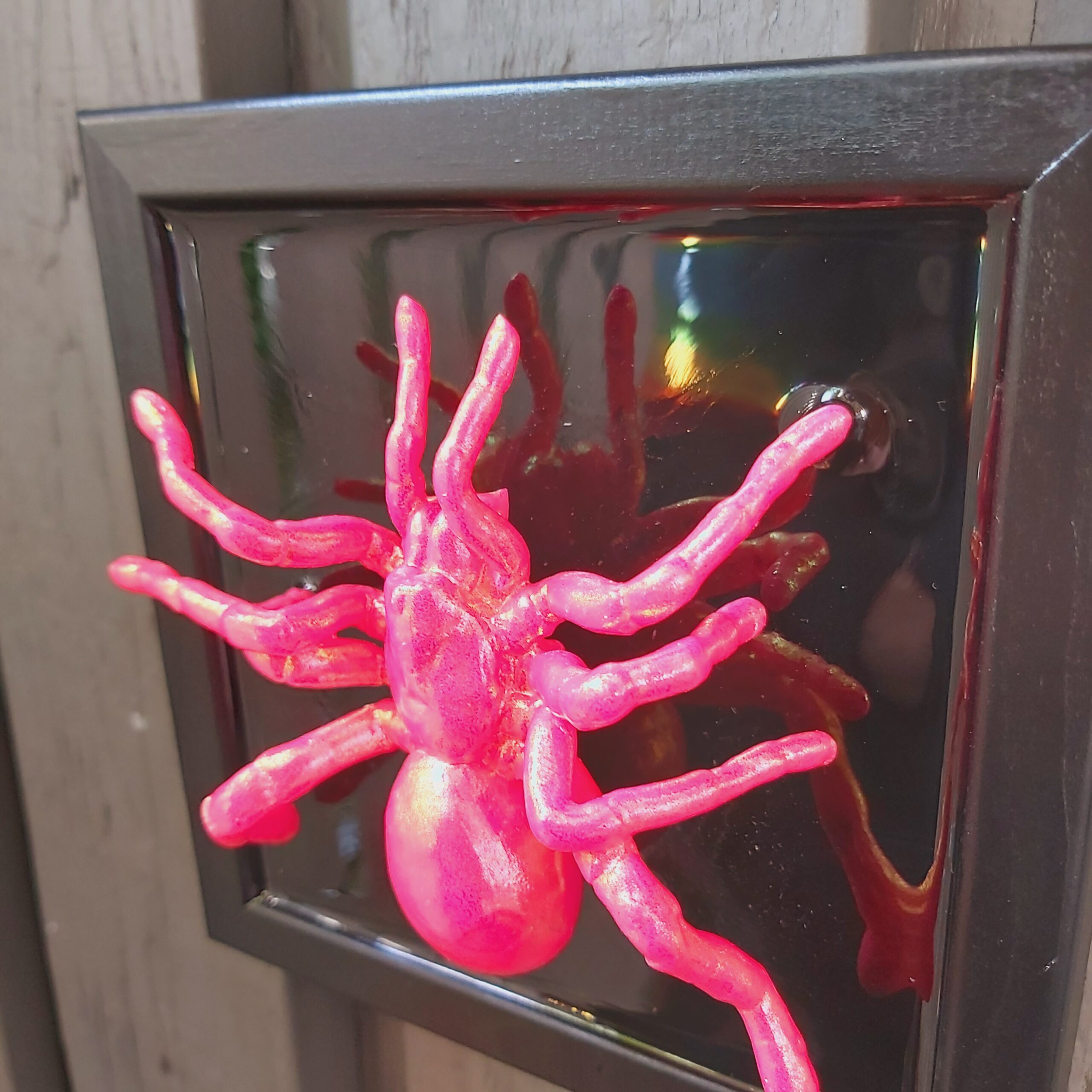 A lovely tarantula rests against a sleek, glossy black resin backdrop.